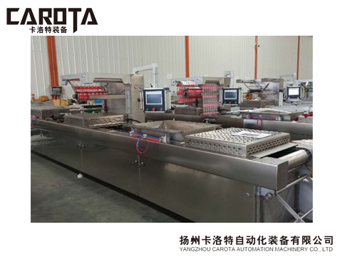 采用連續步進的方式,由下卷膜成型,上卷膜作為封口,包裝的過程由機器自動完成。根據需要,裝填可由人工或機械實現。下卷膜由牽引以定距步進,經預熱區和加熱區,由氣壓、真空或沖模成型,在裝填區填充物料后,進入熱封區。在熱封區中,上卷膜經導輥后覆蓋在成型盒上。然后進行熱壓封合。熱封合完畢后,可以噴印生產批次及生產日期。經橫切、縱切,形成包裝成品。裁切后的邊料可由吸料桶或卷揚裝置收集和清理。